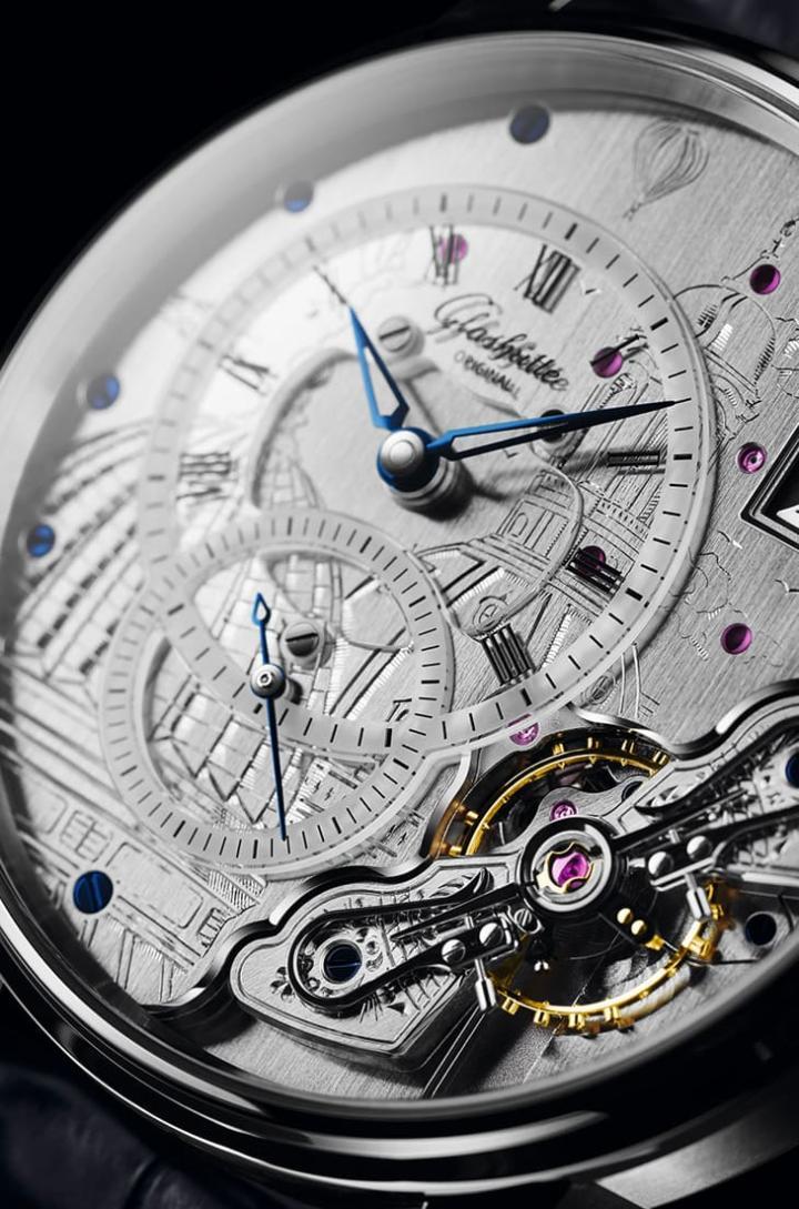 品牌旗下的工艺师此次以手工在面盘与机芯背面分别刻上德勒斯登著名地标与风景的轮廓,我们可以在面盘看到圣母教堂的钟型石制穹顶、美术学院屋顶上展翅欲飞的菲墨女神雕像等等,在建筑屋顶的“空中”还刻出了翱翔的小鸟以及云朵,工艺师甚至还多刻了热气球,呈现出当地居民的日常景色。此外面盘右下角的摆轮夹板不可错过的就是德式制表工艺特色的雕花工艺,这里刻有巴洛克风格装饰,加上双鹅颈式微调机制本身就很精致,其夹板的雕花与面盘的人文自然景色雕刻互相辉映。至于显时功能则由蓝钢指针在银灰色的面盘背景下准确呈现,格拉苏蒂原创于2点方向配置黑底白字的大日期显示,借由深浅色调的对比,强化手表清晰读时效果。