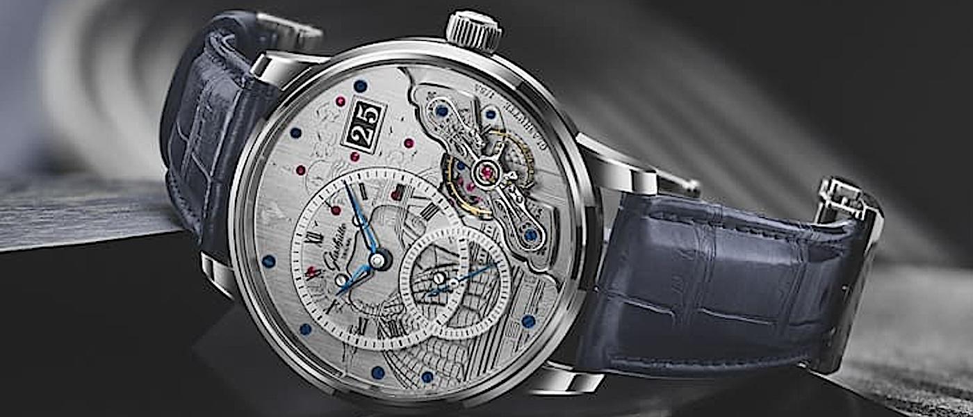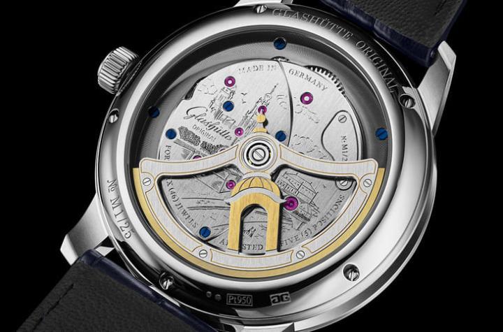 格拉苏蒂原创为了要致敬自己的起源,因此就从德勒斯登当地的人文景致获得灵感,催生出一款偏心机芯倒置手表。表款以铂金制作,表径42mm配上蓝色鳄鱼皮表带呈现出一股大器从容感,不过这款表最引人入胜之处还是在于面盘。它的格局如偏心表盘、大日期显示以及反转置于面盘侧的擒纵系统等都和一般的PanoMaticInverse无异,然而有别于一般版在面盘加上格拉苏蒂经典直纹修饰,全新限量版展现的是另一种美学境界。