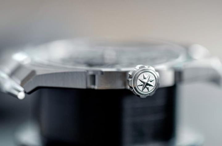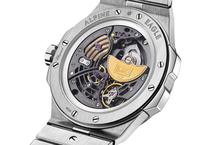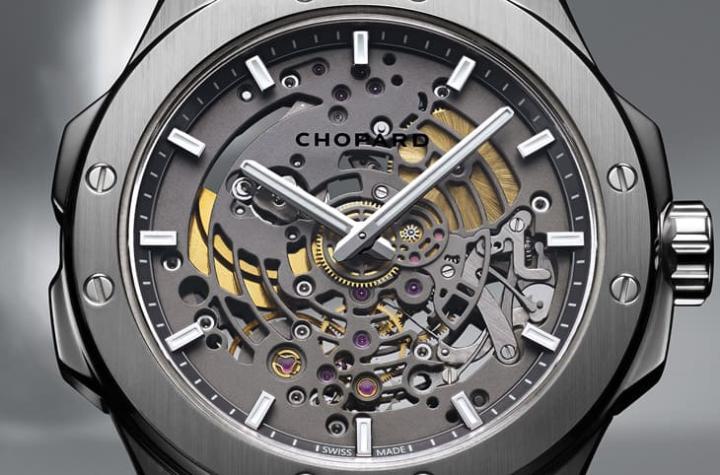 过往Alpine Eagle也曾有过采用钛金属制作的前例,这款表的表径虽然同为41mm,但是仔细比对它和一般的Alpine Eagle 41,会发现它的表圈有降低点厚度,如果直接比较两者的表壳厚度数据,一般的阿胖鹰厚度是9.7mm,至于新出的Alpine Eagle 41 XP TT一举下降至8mm水准,果然是一款名符其实的超薄作品。萧邦替手表采用的5级钛金属表壳为铝和钒的集合,坚固轻盈之余,它的抗腐蚀性效果也很优异,应用在Alpine Eagle这种强调休闲运动风格的作品上相得益彰。