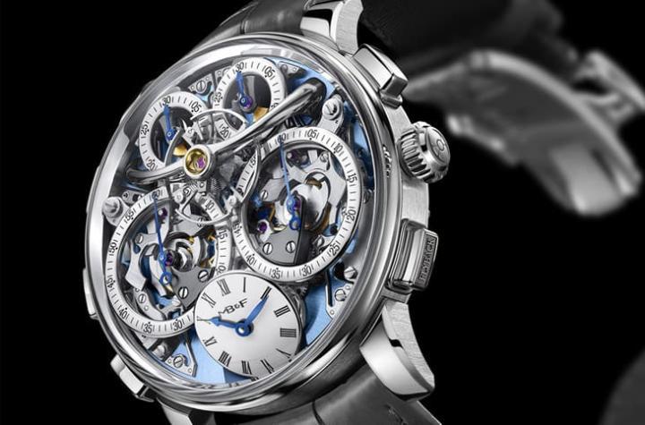 表款内部的手上炼机芯是以同一组擒纵系统连接控制两组独立计时机制,MB&F为此设计出全新型态、动能零损耗的计时机制,个中关键在于创新的内嵌宝石垂直离合器与对应控制系统,这次新加入的飞返装置也采用宝石游盘,避免飞返动作干扰归零,这使得手表虽然功能复杂,但不会出现失准、动能一下就用光的窘境。