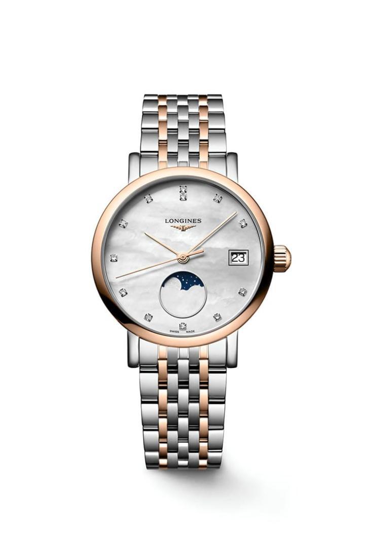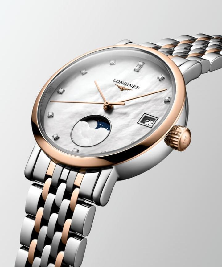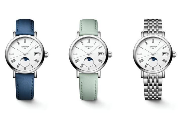 此款手表一律以不锈钢制成,30mm的表径戴在女性手上显得灵巧轻盈,浪琴表分别替手表配置经典蓝色或薄荷绿色皮革表带,亦有不锈钢炼带可选,同时还有镀玫瑰金与不锈钢组成双色炼带造型;随着表带类型不同,Elegant优雅系列月相表的面盘也有相应的变化,例如钢带款或皮带款有三只的面盘都是白色雾面搭配黑色罗马数字时标,另外一款炼带款将面盘改为珍珠母贝,再用Top Wesselton钻石镶于时标位置;最后还有一款定位最顶的款式乃是于表圈、部分炼节镀上玫瑰金,其面盘亦为珍珠母贝搭配镶钻时标,展现相对华丽的风格。