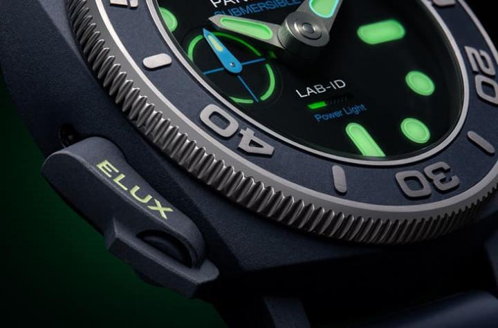 要介绍Submersible Elux LAB-ID PAM01800必须要先考古一下⋯⋯我们都知道沛纳海在20世纪陆续开发出了Radiomir和Luminor两种经典夜光物料,而其实品牌在1966年承接在前两者之后也还发明了一种名叫Elux的夜光技术(看名称就知道和这次LAB-ID的新表有关)。Elux是"Elettroluminescenza"(电致发光)的缩写,这种表面能够均匀发光的发光板不含放射性物质而且耐用,连发光的亮度都可以调整,不过需要有电源供电才能运作,沛纳海当初发明这种技术的目的是要用在航海仪器上,例如船舱内部的讯号板、船上的夜光路径与指示等。看到要吃电的部分很快就会明白Elux应该是和手表比较无关的产物,的确Elux原本使用的对象就不是时计;可是到了现代,沛纳海创意工坊却不作如是想。