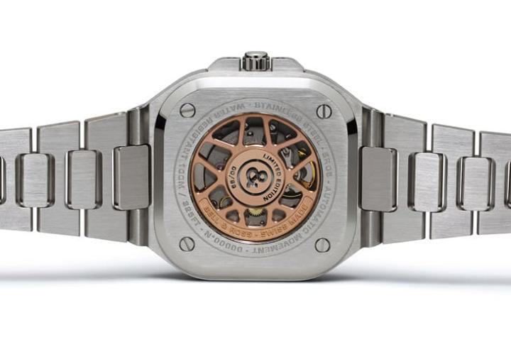 表背露出的机芯自动盘镀上玫瑰金色,与手表的金钢外装正反呼应。