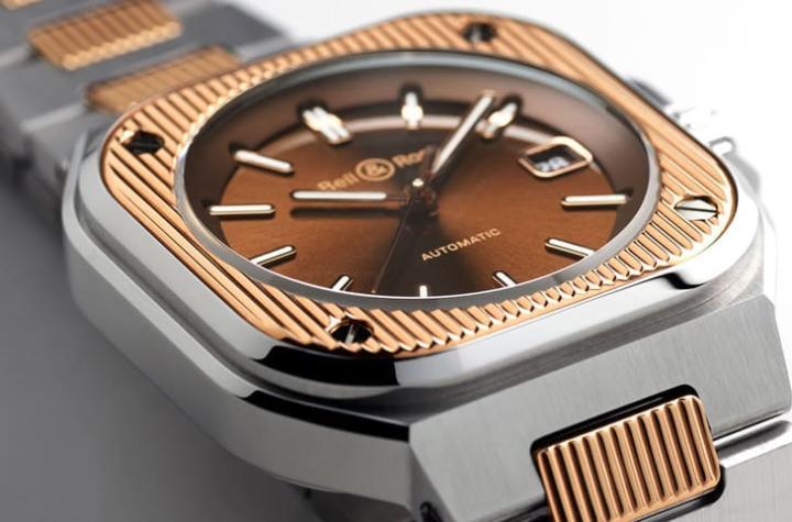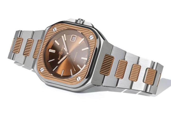 与之前的BR 05 Artline手表同中求异的是,以不锈钢、18K玫瑰金材质制作的表壳呈现出双色的视觉层次感,手表外观主体是以不锈钢制成,而在表圈与整合式炼带的中央炼节部分则换上玫瑰金材质,而且不用靠近看也会注意到,BELL & ROSS精心在玫瑰金零件加上坑纹装饰,这种讲究的金饰工艺属于BR 05 Artline的特色,如今透过异材质诠释后更是清晰深刻。
