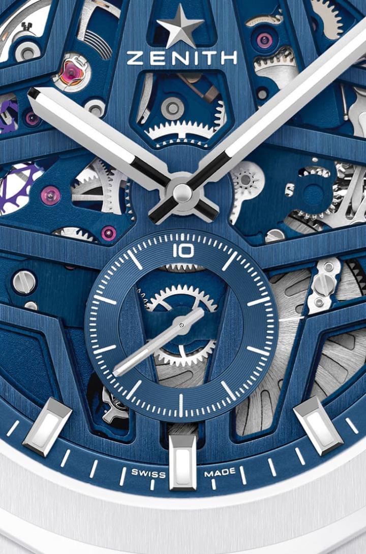 陶瓷材质由于本身硬度极高,要用来制作表壳零件需投入更多资源与时间,以DEFY Skyline镂空表为例,它的外观拥有自成一格的12边形表圈,加上表壳也有相对繁复的切角、折线,若是要用陶瓷达到这种效果,在制作与加工过程都会更为费力费时,何况真力时又还追求要在零件表面加上犹如制作金属材质款式般的多元抛磨饰面,反此都提升了整只表外部零件的工艺难度。