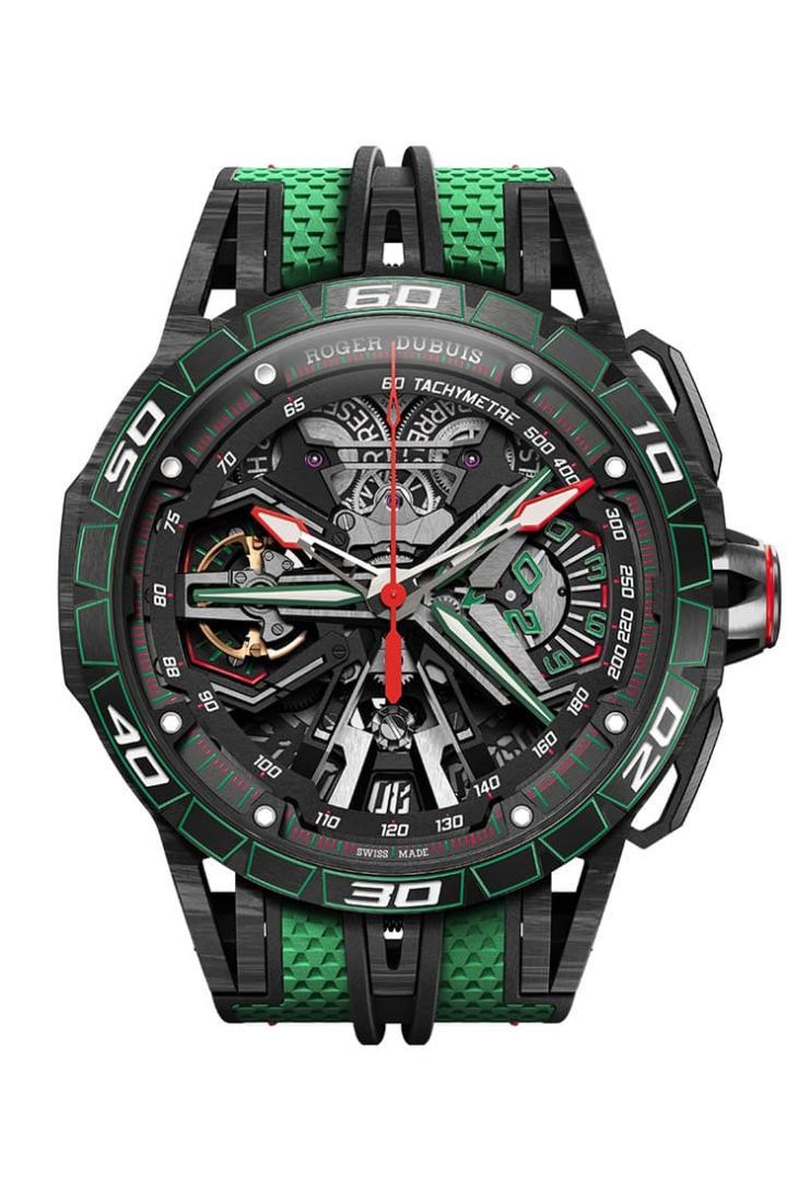 手表的镂空面盘由3点往9点方向可见一个状似"Y"字形的桥板,此处构想同样源自蓝宝坚尼的原型赛车,其Y形头灯出现在车头,而罗杰杜彼巧妙地将这个系节融入镂空机芯上,Y形桥板镀上与手表主题一致的绿色,甚至桥板零件中间还挖出空间容纳Super-LumiNovaTM夜光涂层,使得手表面盘在暗处会有明显的Y形夜光效果,犹如黑夜中原型赛车清晰明亮的头灯灯光。