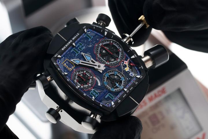 Quartz TPT®石英纤维表壳,表径44.5 x 49.94毫米,时、分、小秒针、日期、追针计时、上炼/调校性能选择器、快速上炼按把,RMAC4自动上炼机芯,动力储存60小时,蓝宝石水晶玻璃镜面及底葢,防水50米,橡胶表带,限量120只。