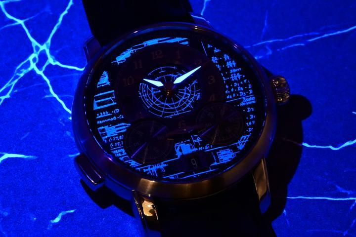 黑色表盘饰有夜光图案,展现来自1920年的书写工具设计蓝图。此外,偏心式小时与分钟子表盘的设计中也融入了设计图样,取材自Montblanc六角白星标志的比例图,这个标志可见于每支大师杰作系列书写工具的笔葢和Montblanc腕表的表冠。