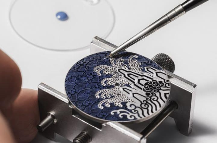 首先看到Métiers d’Art "Tribute to Traditional Symbols"——浪涌乾坤,其面盘表现技法选用源自中国的掐丝珐瑯工艺,由此展现丰富鲜艳的色彩。面盘上呈现的纹样共需使用220根金线和超过50个工时方能完成,而且后续要用珐瑯上色时,还要依据不同的颜色和深浅色调逐层上色并放进窑炉烧制,品牌工艺师要费时至少70个工时才能呈现出手表最终的缤纷色彩。可别以为珐瑯上色之后就可以马上组装,江诗丹顿还会将掐丝珐瑯面盘施以抛光打磨,最后一道收尾步骤是要在图案上加入一层半透明的珐瑯涂层,确保珐瑯釉彩的明艳颜色可以更为清透闪耀。