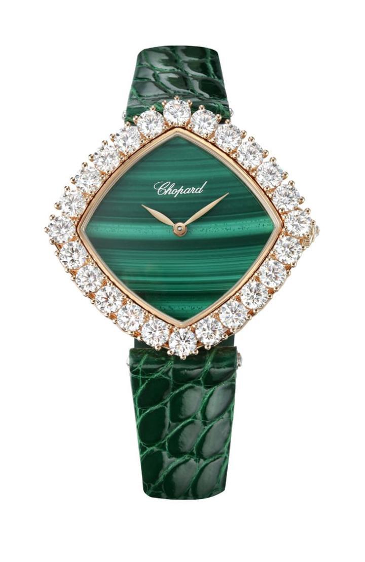 18K玫瑰金材质/Chopard 10.01-C手动上炼机芯/时、分显示/孔雀石面盘/表款镶钻约重5.33克拉/蓝宝石水晶镜面/表径33mm/参考价:¥ 483,300