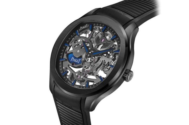 Polo Skeleton Ceramic搭载的同样是1200S1自动机芯,它的微型自动盘在镂空面盘侧就能看出大概,伯爵将多数机芯零件镀上黑色,让它几乎成为视觉感受最低调的一款Polo Skeleton,不过品牌另外于时标、指针的夜光涂层与微型自动盘等处的颜色上又换成蓝色加以点缀,这使得手表不至于一片黑,而在镂空面盘上多了蓝色这个颜色吸引视觉注意。1200S1自动机芯的动力储存44小时没有特别突出,但所幸它是自动上炼机制,佩戴的同时也就是在帮手表不断补充动能,不至于需要三不五时替手表亲自动手上炼。