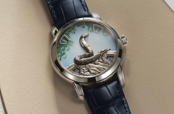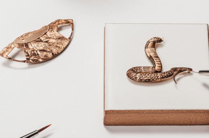 蛇这种动物在传统文化中有敏捷、智慧、富足和新生等各种正面意义,江诗丹顿这次精心挑选“眼镜蛇”作为蛇年生肖表的代表图腾,从面盘上耸立一条蓄势待发的立体蛇形图案,让人对2025年即将展开新的一年也充满了满满的冲劲与期待。品牌创作第二轮蛇年生肖表面盘可粗分成两大工艺,包括手工雕刻与珐瑯彩绘,首先工艺师会先将贵金属片以手工分别刻出找脚的眼镜蛇,以及作为近景与陪衬的岩石,工艺师手工雕刻的细腻度从蛇吐信以及蛇身的鳞纹,还有塑造岩石立体感的斑驳纹路可见一斑。光是要雕刻出这两种图案就需花费工艺师三天的工时。