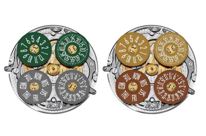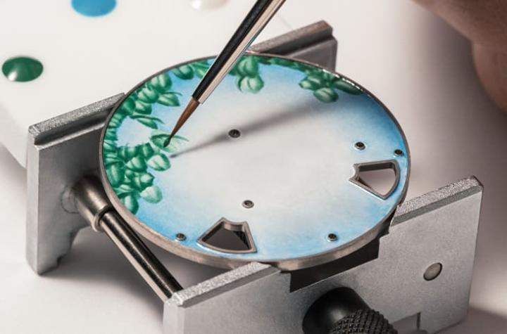 面盘上的主角完成之后,珐瑯工艺师继续运用大明火珐瑯工艺替面盘加上渐变色泽作为背景,颜色呈现由面盘中央到边缘从浅到深的变化,如此一来眼镜蛇周围有点像是会发出吸引人的光华,将视线聚焦在面盘之上。光有渐层珐瑯背景还不够,江诗丹顿顺应整个场景的设定,再用微绘珐瑯在面盘上缘手绘出茂盛的植物纹样——玫瑰金款的植物为棕色系、柏金款的植物为绿色系,待植物图案画好后还会在面盘覆上以一层透明釉,中间这些每一次上色过程中,都需把面盘送入在820°C~850°C的窑炉烧制,持续多道循环后,确定面盘的珐瑯图案与颜色能保持无误的状态后,才会与前述的眼镜蛇与岩蛇金雕结合,形塑出完整的艺术大师中国十二生肖传奇之蛇年表。手表依旧用分据面盘四个角落的视窗来显示时、分、日期与星期资讯,但是和前一轮的生肖表相较,第二轮的生肖表因为面盘珐瑯颜色变得更缤纷鲜艳,所以四枚显示窗底下转盘的颜色也随之改变,江诗丹顿会视显示窗周遭背景的颜色加以调整,例如铂金款面盘上缘两枚视窗旁边是绿色的植物图案所以时、分转盘是绿色,而面盘下缘两枚视窗因为刚好位在岩石图案里面,因此星期与日期转盘便会呈现灰色调。