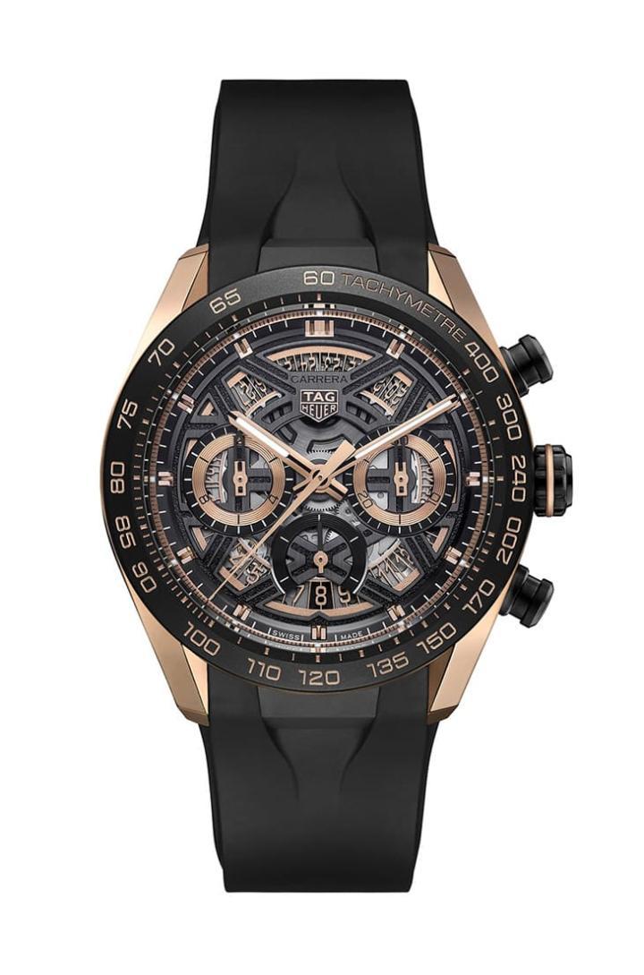 玫瑰金款的Carrera Extreme Sport计时码表面盘大致为黑色,可是泰格豪雅替其配置金色测速计刻度、金色的小表盘刻度环,以及金色的镂空日期转盘等等,还有时标和指针也是镀金处理,搭配黑色橡胶表带,带出手表动感中别具高贵气息的精致风格。