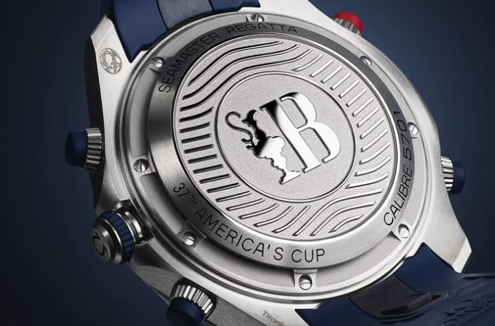 海马Regatta手表的表背以与表壳相同的钛金属制作实底盖,底盖上刻有根据亥姆霍兹共振(Helmholtz Resonance)原理设计的波浪纹图案,图案中间包围著第37届美洲杯帆船赛的标志,这里的波纹其实也有暗示效果,由于海马Regatta手表具有发声提醒的作用,因此表背波纹代表手表内部设有共振腔,可以提升声音提示功能的音量,让表主在航行时确切听到提示音响,有助于掌握航行中的各项目标。