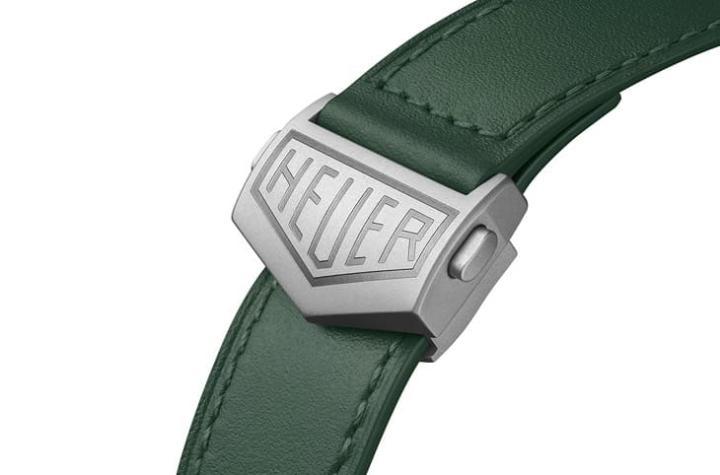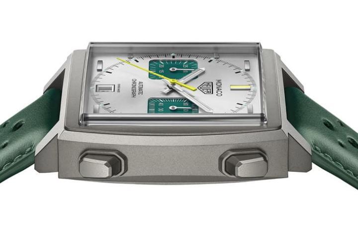 Monaco计时码表赛车绿限量版采用喷砂钛金属制作,搭配绿色穿孔小牛皮表带,既展现出早期赛车表的动感个性,也融入了一丝英国绅士气息,至于表带上的表扣也比照表壳采用刻有品牌标志的以钛金属摺叠扣。经过喷砂处理的表壳,连同计时按把与表冠都有相同的视感与触感,其有别于抛光处理不容易印上指纹、也不容易突显刮痕,加上钛金属又有坚固、轻量以及低致敏等特性,凡此都有助于强化手表整体的运动风格。