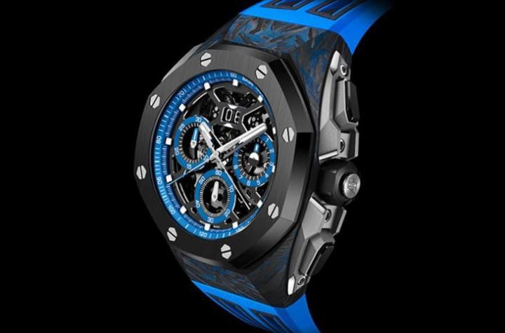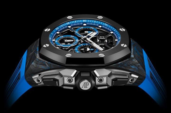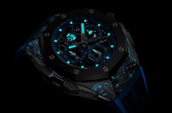 爱彼首次采用创新的彩色锻造碳材质,有别于过往的锻造碳材质,新材质乃是以最先进的色度锻造技术(Chroma Forged Technology,CFT)打造出整体为深黑色中带有其他颜色的创新材质。爱彼研发总监Lucas Raggi表示,CFT锻造碳经过5年时间才开发完成,特色在于可以替传统的锻造碳「上色」,同时也保留了这种材质原本优异的特性;值得一提的是,品牌在融入色彩于锻造碳之际,还一并优化了材质的耐湿、耐热和抗震效果,提供手表外部更理想的保护性。