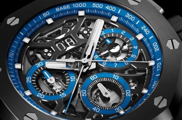 开面设计的面盘与前作一致,不过不同于前作呈现黑、灰双色为主的低调设计,新款皇家橡树概念双追针GMT大日期计时码表将面盘外围的测速计刻度环、小表盘刻度环都改成蓝色,与镂空的黑色桥板以及灰色调的机芯零件搭配再度强化手表的彩色风格,其中包括一枚追针指针,计时分针与两地时间指针等都涂上蓝色(小秒针则还是金属原本的银色调),围绕著蓝色的主体感因此更为强烈。
