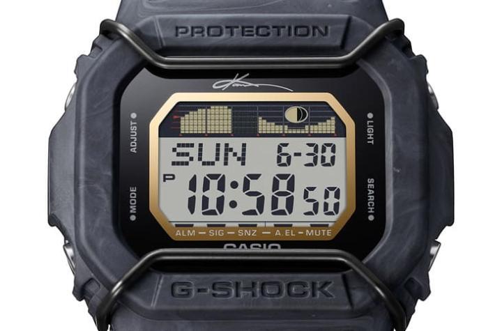 五十岚卡诺亚这次和G-SHOCK联名的作品奠基于后者G-Lide产品缐中的GLX-5600型号,此型号特色包括提供潮汐图、月龄、潮涨/潮退时间和水位,以及日出/日落时间等丰富资讯,俨然就是冲浪爱好者的天菜手表。G-SHOCK采用生质树脂制作GLX-5600KB的表壳和表带等零件,五十岚卡诺亚本身在手表研发过程中也提出他的想法与创意让品牌能够据以发展出这位主人翁的特色,例如手表外观呈现不规则的黑色纹路,就像五十岚卡诺亚平常在海上常见的波浪充满有机独特美感。