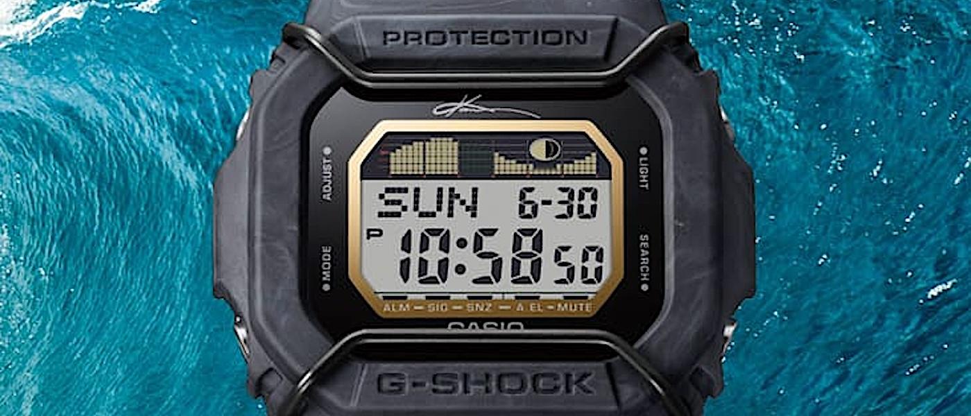 品牌特别替GLX-5600KB加上保护杆装置以及在面盘周围加上金色蒸镀处理,同时细看手表的细节也充满这位顶尖冲浪选手的个人识别元素,像是EL背光照明、背盖以及面盘中央顶部都有五十岚卡诺亚的签名字样,而下半部表带上印有选手本身的号码50。至于手表的外盒包装也富有巧思,外盒印上五十岚卡诺亚常去冲浪的海滩景色照片,表盒本身也印有蔚蓝、沁凉的海水图案(上头在烫上金色的选手签名与品牌字样),让人一拿到表盒就可以感受手表的热情活力。
