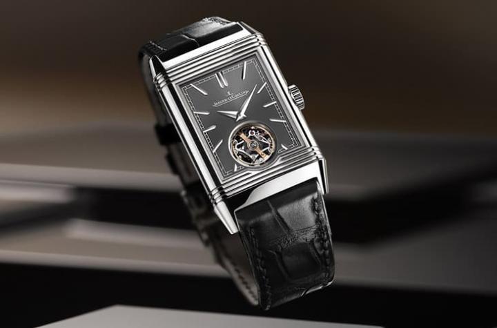 最后也是这批新作中功能最复杂的Reverso Tribute Duoface Tourbillon翻转双面双时区陀飞轮,手表与积家2023年推出的玫瑰金款最明显差别就是表壳改用不锈钢制作,稍微降低了收藏家入手的门槛。积家最初从翻转设计中延伸出双面双时区的时间点可追溯至1994年,到了后来积家又尝试把双面双时区概念与陀飞轮结合,如此可以让表主在正、反面都能清楚看见陀飞轮机制的结构以及运转动态。积家在制作Reverso Tribute Duoface Tourbillon时以滚珠轴承代替陀飞轮外框架顶层的桥板,再用自家专利的S形摆轮游丝,把摆轮固定于陀飞轮中央,由于手表的设计不需占掉太多垂直空间,因此它的整体厚度9.15mm,以陀飞轮手表而言属于相对纤薄的水准。表款正面为灰色太阳放射纹、背面则是开面设计,并在机板上饰有巴黎钉纹,此处的小表盘经过银色太阳放射纹修饰,与正面面盘的灰色调互成深浅对比。手表搭载847机芯也是手动上链,但因为含有复杂功能的关系,因此动力储存稍降至38小时,表主佩戴时养成定期上链的习惯有一定必要性。
