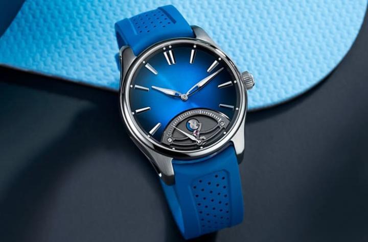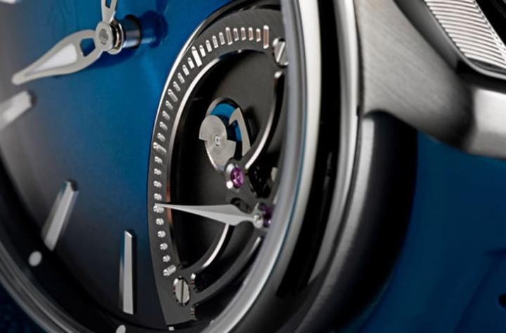 逆跳秒针区银色模压镂空桥板的美感,令人联想起品牌标志性的陀飞轮桥板。蜗形凸轮底下的双色圆盘显示手表处于第一个或第二个30秒区间,周到的设计思维使手表更添动感与视觉吸引力。此外午夜蓝烟熏面盘和带有立体切面的时标以及镂空指针也还蛮吸睛的,手表本质上虽然只有三针功能,但是它带来的赏心悦目效果远超多数的三针手表。