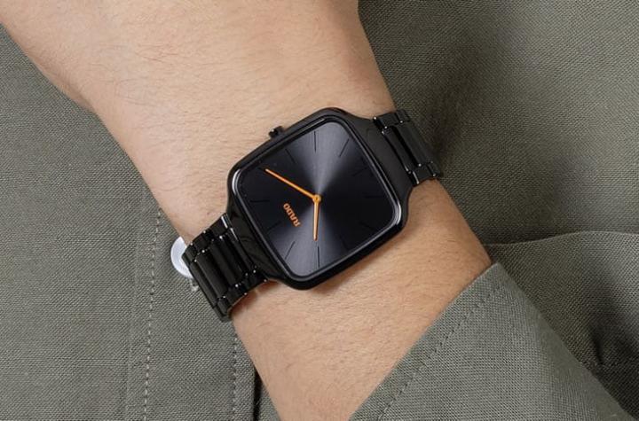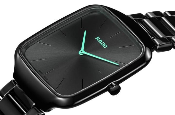True Square真我方形系列超薄高科技陶瓷表外观蜿蜒曲折的设计显得精美细腻,触感则是光滑亲肤。其中两款夜幕黑款式街搭配搭配黑色面盘和黑色印制时标展现低调细腻色调,雷达表分别以两种颜色的漆面指针为手表点亮视觉效果,包括绿松石色或太阳橙色,除了指针还有12点方向的品牌Logo也使用相同的颜色,在黑色背景烘托下,彩色漆层便犹如城市夜景中的明亮灯光,让人第一眼就尽收底眼。