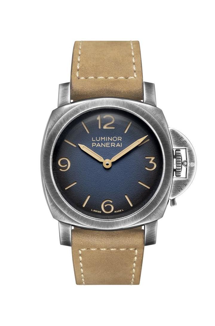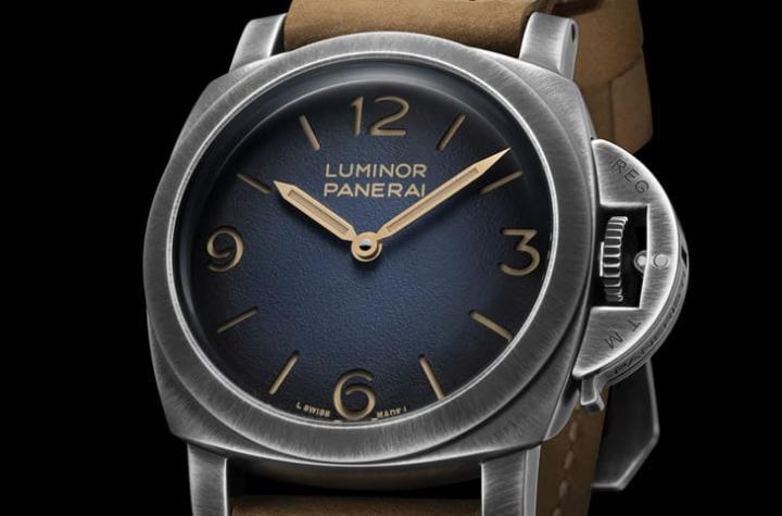 PAM02025采用蓝色渐层面盘,三明治面盘夹的是米白色Super-LumiNova® X1夜光涂层,搭配金色铅笔形指针展现出一丝高雅个性,同时在手表表冠护桥上的拉杆上也刻有"Paneristi"字样,这和表背烟熏蓝宝石水晶底盖上的Paneristi 25周年纪念标志等都突显了手表的特别主题性。