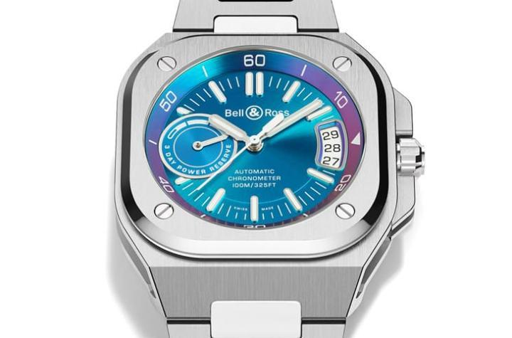 BR-X5 Iridescent外部的设计和系列多数作品一致,包括不锈钢材质、表径也是41x41mm的方中带圆造型,同时表冠旁有护肩结构加以保护等等。面盘则是实用至上的格局,其具有最基本的三针功能,另在3点方向开了一扇能显示过去、现在和未来的3天日期显示(颇有早期飞行表的风格),再来9点方向的动力储存显示则是替手表的三日链机芯锦上添花,表主随时能注意到手表的动力剩余情况。此外像是时标与指针上都填入了白色的Super-LumiNova X1夜光物料,维持手表在黑暗环境中的辨时效果。