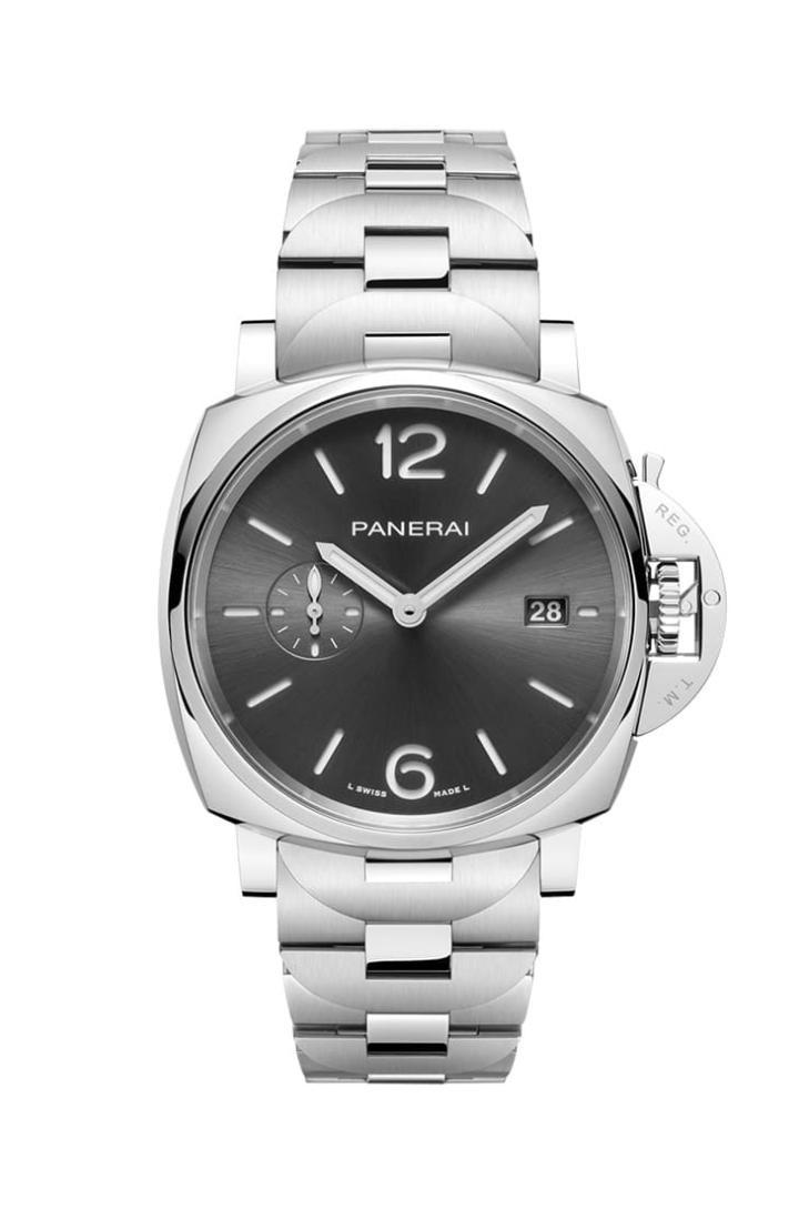 这次换上新链带的按照系列和材质可以概要分为三种。其中Luminor Due系列有不锈钢款式3只,分别是Luminor Due Metal Bracelet PAM01508、PAM01539与PAM01387。PAM01508的表壳为38mm,搭配白色太阳放射纹三明治面盘,上头涂覆米白色的Superluminova®夜光涂料,而PAM01539与PAM01387都是42mm,前者的三明治面盘为酒红色太阳放射纹,夜光涂料为白色,后者的三明治面盘则是碳灰色太阳放射纹,夜光涂料同样也是白色的,由颜色的对比强化了清楚的视读效果。