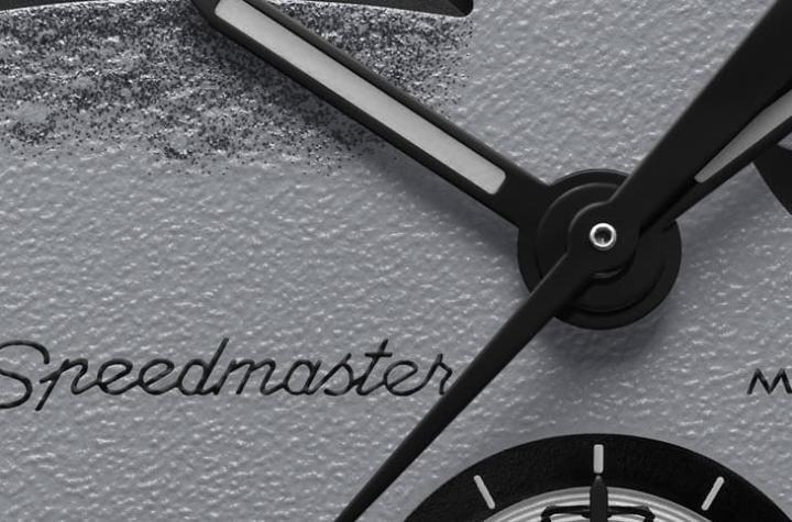 手表的表圈同样是黑色不变,但是面盘改成了灰色为主搭配黑色的分钟刻度以及小秒盘刻度圈等,乍看这款表的面盘变得趋于平面化,因为小秒盘不像过去的MoonSwatch带有凹陷层次,加上月相和地相视窗也是直接镂穿出扇形轮廓,所以才会有面盘趋于扁平化的感受。不过近看手表面盘会发现别有洞天,这次SWATCH在灰色面盘上饰以不规则的砾纹,借以诠释月尘的概念,也让手表更有一种置身在月亮的临场感。