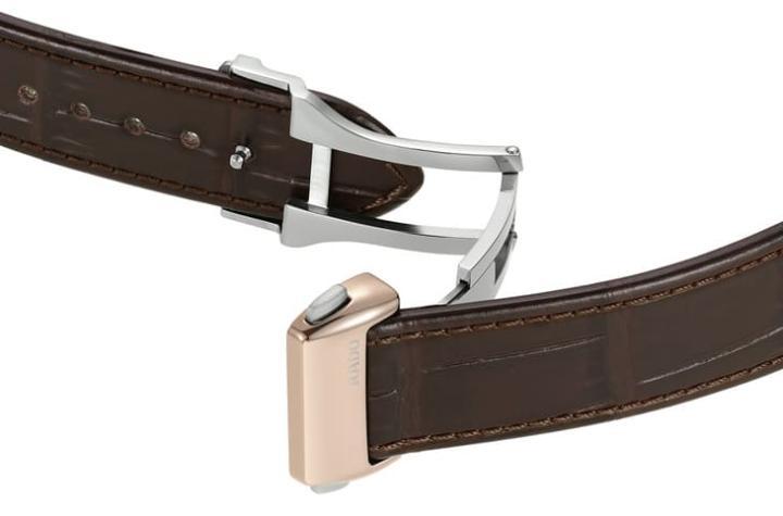 手表配置棕色皮革表带,搭上抛光钛金属可伸缩折叠表扣以及抛光Ceramos™金属陶瓷扣面。