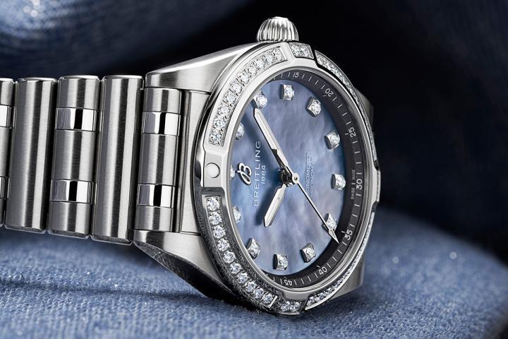 不锈钢表壳,表径28毫米,珍珠母贝表盘镶嵌实验室培育钻石,时、分、秒,百年灵72 SuperQuartz™石英机芯,COSC认证,蓝宝石水晶玻璃镜面,防水100米,不锈钢链带。