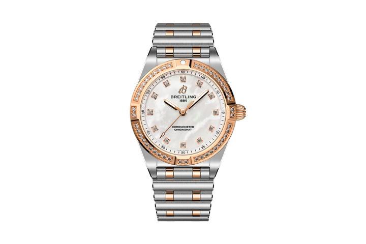 不锈钢表壳,18K红金表圈镶嵌实验室培育钻石,表径28毫米,珍珠母贝表盘镶嵌实验室培育钻石,时、分、秒,百年灵72 SuperQuartz™石英机芯,COSC认证,蓝宝石水晶玻璃镜面,防水100米,不锈钢及18K红金链带。