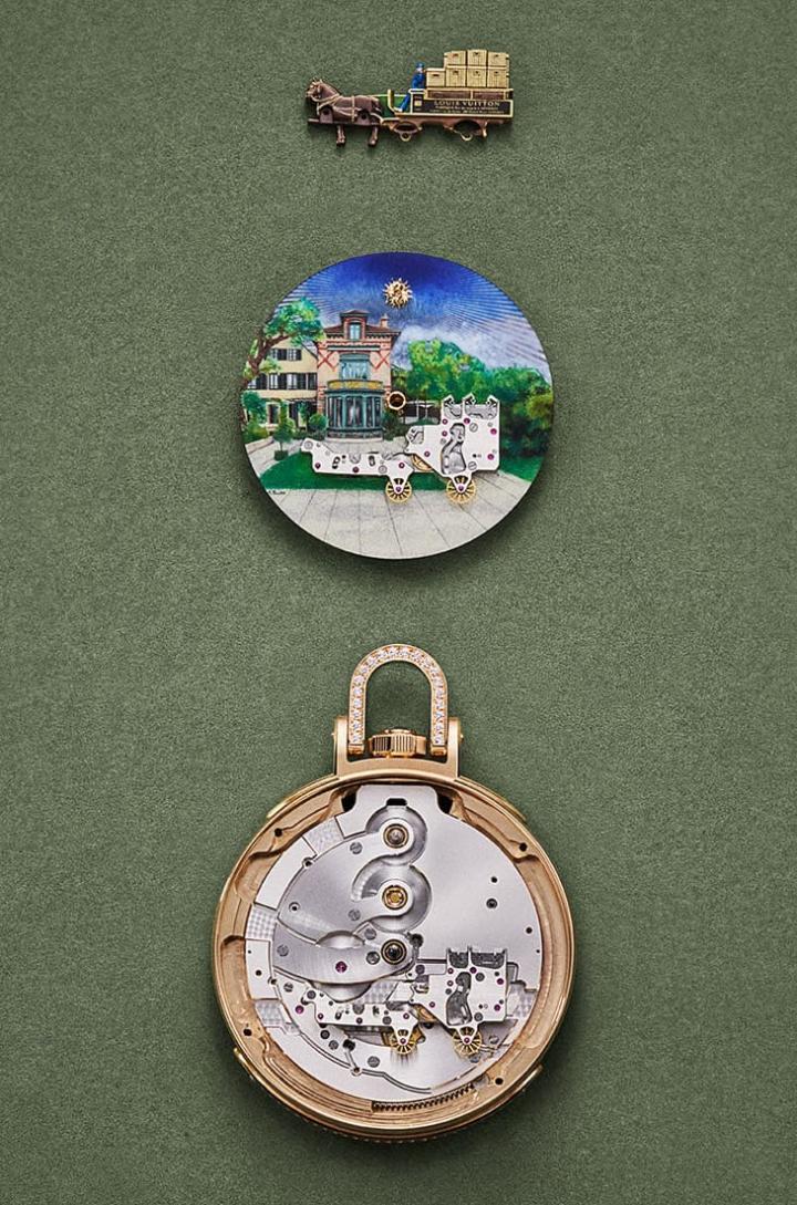 怀表面盘采用珐琅装饰,路易威登的长期合作伙伴Anita Porchet,他挑选能展现Asnières之美与精神的珐琅颜色,接著在面盘涂上多层彩色珐琅,多达35种不同的色调,逐一涂上每一种颜色。这位经验丰富的珐琅大师独立烧制每一种颜色,一共约烧制20次。经过极为严谨且精确的加工流程后,再为面盘进行最后的装饰:涂上一层半透明的珐琅保护层,为整幅画面带来灿烂的光泽。珐琅以绝美的光影反射效果呈现了路易威登的故居,而这栋宅邸也是著色过程中最复杂的。而房子前面一辆装满路易威登行李箱的19世纪马车,让人想到1887年的路易威登品牌广告,和约于1888年在Asnières拍摄的路易威登家族肖像,描绘了创办人家族三代──路易(Louis)、乔治(Georges)、加斯顿-路易.威登(Gaston-Louis Vuitton)以及围坐在马车旁的工匠。
