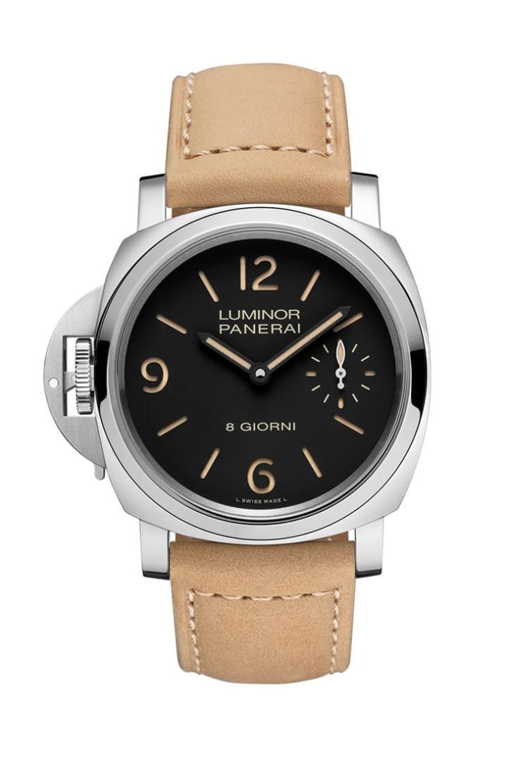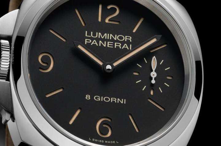 手表面盘为三明治结构,中间的Super-LumiNova®夜光涂层为米色,包括镀成黑色的指针其夜光涂层也是相同颜色,在黑色面盘衬托下,会让手表呈现出前述的怀旧感。而受到机芯转了180度的关系,因此这款表的小秒显示也就从9点方向转移到3点方向,另外面盘6点方向印上的"8 GIORNI"字样就算看不懂后面的义大利文,从数字方面也不难推测此处写的是指手表的动力储存空间。