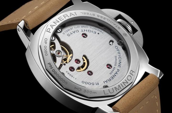 PAM01655搭载的P.5000手上链机芯由于灵感来自沛纳海经典作品采用的Angelus SF240机芯,也因此P.5000的动力储存也比照前辈达到8日链的长效水准(不过P.5000的摆轮震频3Hz倒是比Angelus SF240的2.5Hz要快一点)。透明底盖下看到这枚机芯具有大片的底板,表面简约以水平拉丝处理,同时表主还会注意到擒纵系统底部有横跨式桥板支撑,借以提供更安稳可靠的固定效果。除了长动能,PAM01655虽然不是专业潜水表规格,但是它的防水性能也有着媲美潜水表的300米,日常佩戴如遇到碰水情况几乎可达无往不利的境界。