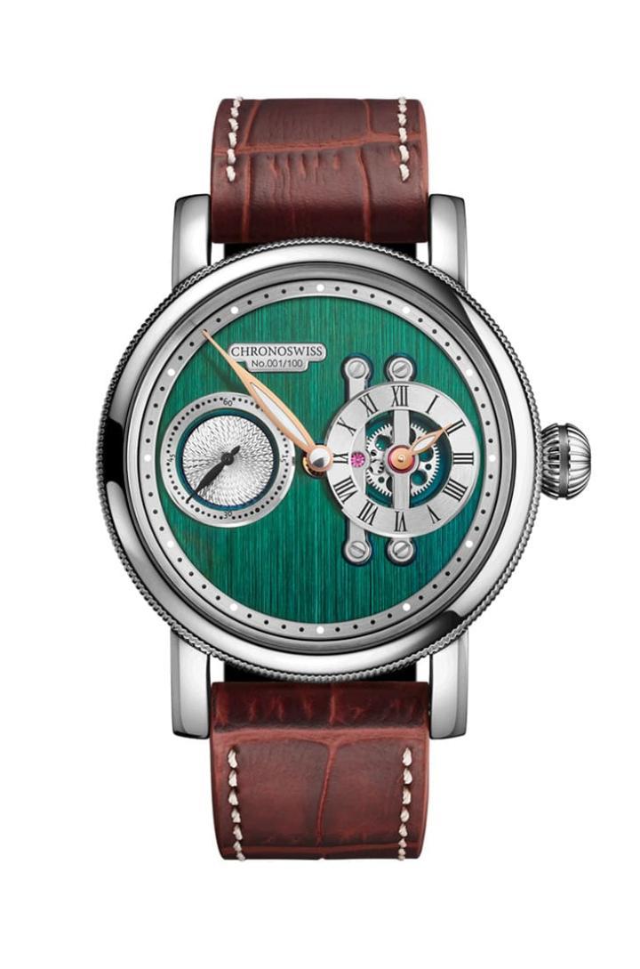 其中Terra款式具有雷射雕刻的棕色PVD面盘,诠释出大地原始质朴的印象,富有纹理的面盘捕捉了自然景观的精髓,唤起人们与地球之间的紧密联系。手表配以内敛沉稳的黑色小牛皮表带,棕色面盘在表带、银白色表壳的烘托下相当抢眼。至于Highland款式的面盘则是呈现绿色变色效果,CHRONOSWISS以CVD技术和垂直缎纹处理加以修饰,如此一来绿色会随着佩戴者手腕活动而产生深浅色泽变化,展现出受到苏格兰高地起伏丘陵与神祕荒原启发的设计灵感。手表搭配棕色小牛皮表带,与Terra款式般都以自然景致为题的设计让人充满亲切感与好感。