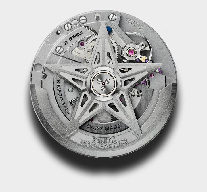 钛金属表壳,陶瓷单向旋转表圈,表径42.5毫 米,银色太阳纹表盘装饰四芒星图腾,时、分、秒、日期,El Primero 3620 SC自动上链机芯,动力储存60小时,蓝宝石水晶玻璃镜面及底盖,防水600米,随表共附织物快拆表带(左)、钛金属快拆链带及橡胶快拆表带(右)。