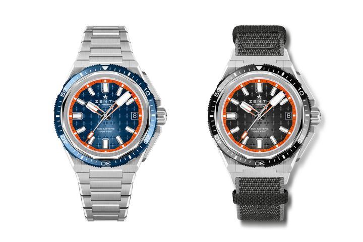 钛金属表壳,陶瓷单向旋转表圈,表径42.5毫 米,时、分、秒、日期,El Primero 3620 SC自动上链机芯,动力储存60小时,蓝宝石水晶玻璃镜面及底盖,防水600米,随表共附钛金属快拆链带(左)、织物快拆表带(右)及橡胶快拆表带。