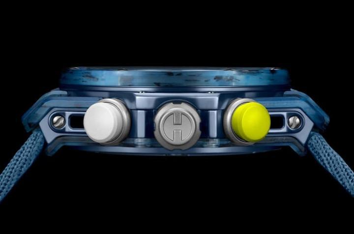 从Big Bang Unico乔科维奇计时码表正面表耳处可见宇舶专利的One Click单键表带快拆装置,这款表罕见地一次附上四种表带让表主可以随心所欲决定当天要换上何种表带,包括材质为天然棉的网球护腕表带、蓝色弹性聚酯纤维表带(换上这种表带手表便能处于最轻的总重状态)、蓝色高科技Velcro表带,以及白色橡胶表带,其实四种表带戴著运动很合适,不过加上表带自身的重量,手表整体总重也会出现细微差异,其中最令人惊艳的要属网球护腕表带,因为乔科维奇比赛时习惯在双手手腕戴上护腕,既能保护手腕,也能用来擦汗,因此是他比赛中不可或缺的重要配件,这个习惯促使宇舶发想出Big Bang Unico乔科维奇计时码表的特色表带,日后乔科维奇若觉得单纯戴表打球不适应,切换成这种表带能让他迅速进入比赛状态。
