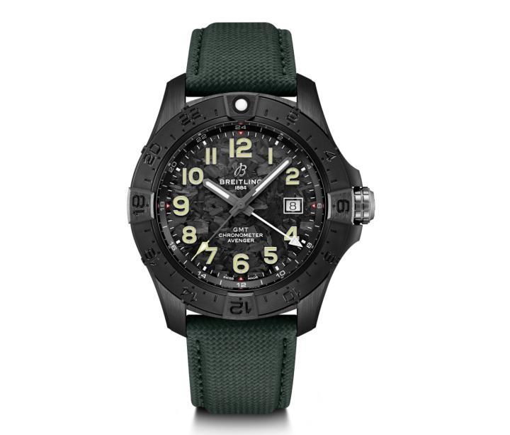 表盘采用黑色碳纤维制作,搭配绿色阿拉伯数字时标。表盘延续计时码表经典的3-6-9式布局——3点为30分钟计时盘,6点为12小时计时盘,9点为小秒针,日历窗巧妙融入6点的计时盘。搭载自制 Calibre B01 自动上链机芯,摆频28800vph,动力储备70小时,搭配绿色军事风皮革表带。