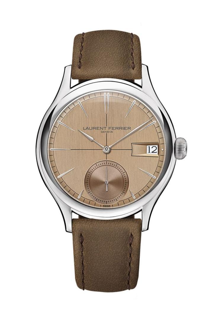 LAURENT FERRIER替手表配置的玫瑰色面盘同时拥有沙色与泥土色色泽,这种中性色调与大自然和土地紧密相连,象征著稳定与宁静的氛围,也让人想到早期时计那种古色古香的细致格调,由于面盘有多种饰面,因此能让沙色、泥土色随着光线照射呈现由浅至深的变化。