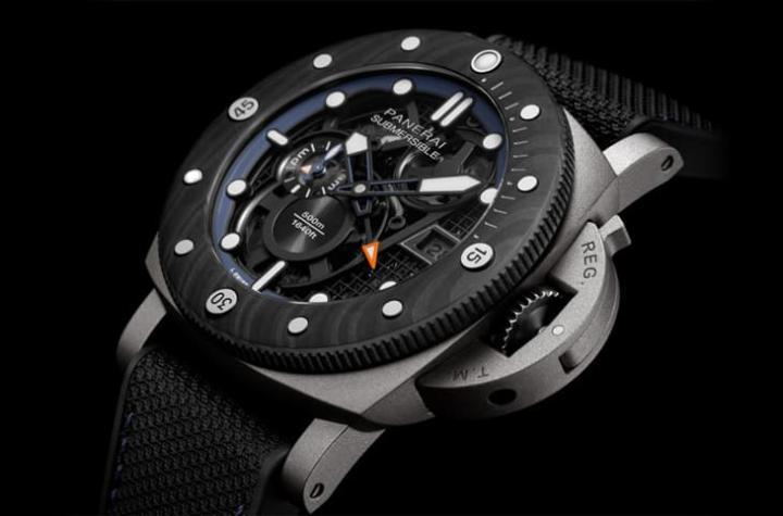 PAM01670采用过直接金属雷射烧结(DMLS)钛金属制作表壳,这种技术大致而言是把钛金属粉末烧结成厚度仅0.03mm的钛金属层,接着再把钛金属薄层一层一层往上堆叠,直到勾勒出整枚表壳的形状为止,它与一般钛金属材质同样拥有坚实强度,但是重量比不锈钢轻40%、硬度更高了60%之多,用来制作运动表是再理想不过的选择。除此之外,沛纳海也改用独家的Carbotech™碳纤维材质制作手表的单向旋转表圈,它的外观带有不规则独特纹理,耐腐蚀性果佳而且硬度高,重量比不锈钢轻约80%,因此PAM01670表径虽达47mm,但是它的重量实际上没有看起来重,长时间进行户外活动也不易感到负担。