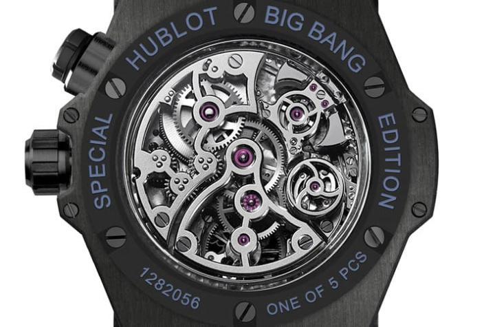 碳纤维材质/HUB8810手动上链机芯/时、分、小秒显示/三问功能/陀飞轮装置/计时码表功能/蓝宝石水晶镜面、透明底盖/防水30米/表径45mm/限量5只/参考价:¥ 2,132,200