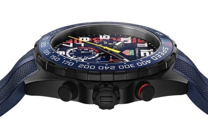 Formula 1 x 甲骨文红牛车队限量版计时码表采用黑色DLC不锈钢制作,表圈则是以铝合金打造,表带配的是蓝色橡胶表带,提供舒适且活动自如的佩戴感受。整体来说,在手表身受会找到深蓝色、黑色、红色与黄色的多重色彩,这很明显是受到红牛车队车衣以及赛车涂装的启发,套用在手表上显得大胆、充满活力,别具红牛车队追求极致速度的霸道气势。