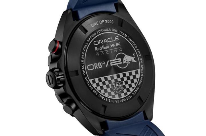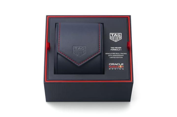 Formula 1 x 甲骨文红牛车队限量版计时码表表背度成黑色的实底盖暗示手表搭载石英机芯,底盖表面刻有赛车方格旗以及红牛车队20周年的纪念图案,彷佛回顾泰格豪雅和红牛车队合作期间,一步步见证他们成为车坛王者的美好过程,底盖上另刻有手表的限量数(3000只),比起一般手表还是多了点纪念意义,而相同的配色逻辑也蔓延到了手表的表盒,其以深蓝色为主,辅以红色细节的组合,再次辉映着红牛车队深植人心的印象,让人在看到表盒时,就可以提前感受到手表具备的强悍赛车魂。