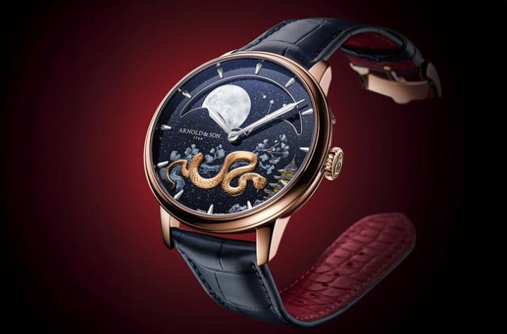 表款搭载亚诺表自主开发的A&S1512手上链机芯,在透明底盖下可以清楚窥见其作工处理的细腻度,这枚机芯配备双发条盒,动力储存高达90小时,摆轮震频则是平稳的3Hz,突显ARNOLD & SON注重实用性以及手表运作稳定性的理念。而因为手表的月相显示特别大,因此它的精准度也不容小觑,藉由安排齿数更密的月相齿轮,使其每122年才需要调校一次月相,而且在表背的擒纵系统旁,还贴心地增添了刻度化的月球阴晴图案佐以指针显示月相动态,辅助佩戴者快速掌握更详尽的时间资讯,内外讲究的设计与其稀有的限量数互相辉映,为2025年高级手表市场相当有魅力的一款生肖表杰作。
