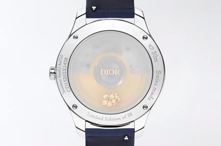 表背的雾面蓝宝石水晶底盖中间和下缘分别饰有则以玫瑰金DIOR标志以及花卉图案,若隐若现地让佩戴者略窥机芯运作的动态美感。底盖下方为Sellita SW300自动机芯,它属于中规中矩的基础机芯,摆轮震频达4Hz、动力储存则是42小时,包覆于表壳之下,整体的防水性能亦具备30米的基本功,同时注意看到底盖下缘还刻有手表的限量资讯,不到40只的限量数诉说其制作难度相对高,且有特定年份与主题限定的稀有性,同样的珍贵意义也反映在手表的定价上,比起一般金钢双色基本款,Dior Grand Soir蛇年限量表显然价格高出了许多档次,是品味收藏家2025年密切观察的一大目标。