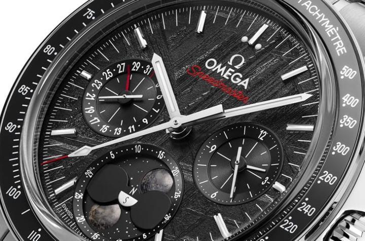 欧米茄精心选择了两种陨石制作手表面盘,来自天外又经过长时间与其他宇宙物质、大气层等互相摩擦之下,每一枚陨石面盘表面本来就带有独一无二的纹理,OMEGA为了强化视觉效果,还进一步在陨石上进行黑色PVD涂层或电镀灰色涂层,前者配的是黑色陶瓷圈以及黑色同心圆纹小表盘,后者搭配蓝色陶瓷圈与蓝色同心圆纹小表盘,两款的时标与指针都是白金材质,不过蓝色陶瓷款的这两种零件额外添上蓝色PVD涂层,令指针在灰色系的陨石面盘上能够看得更清楚。